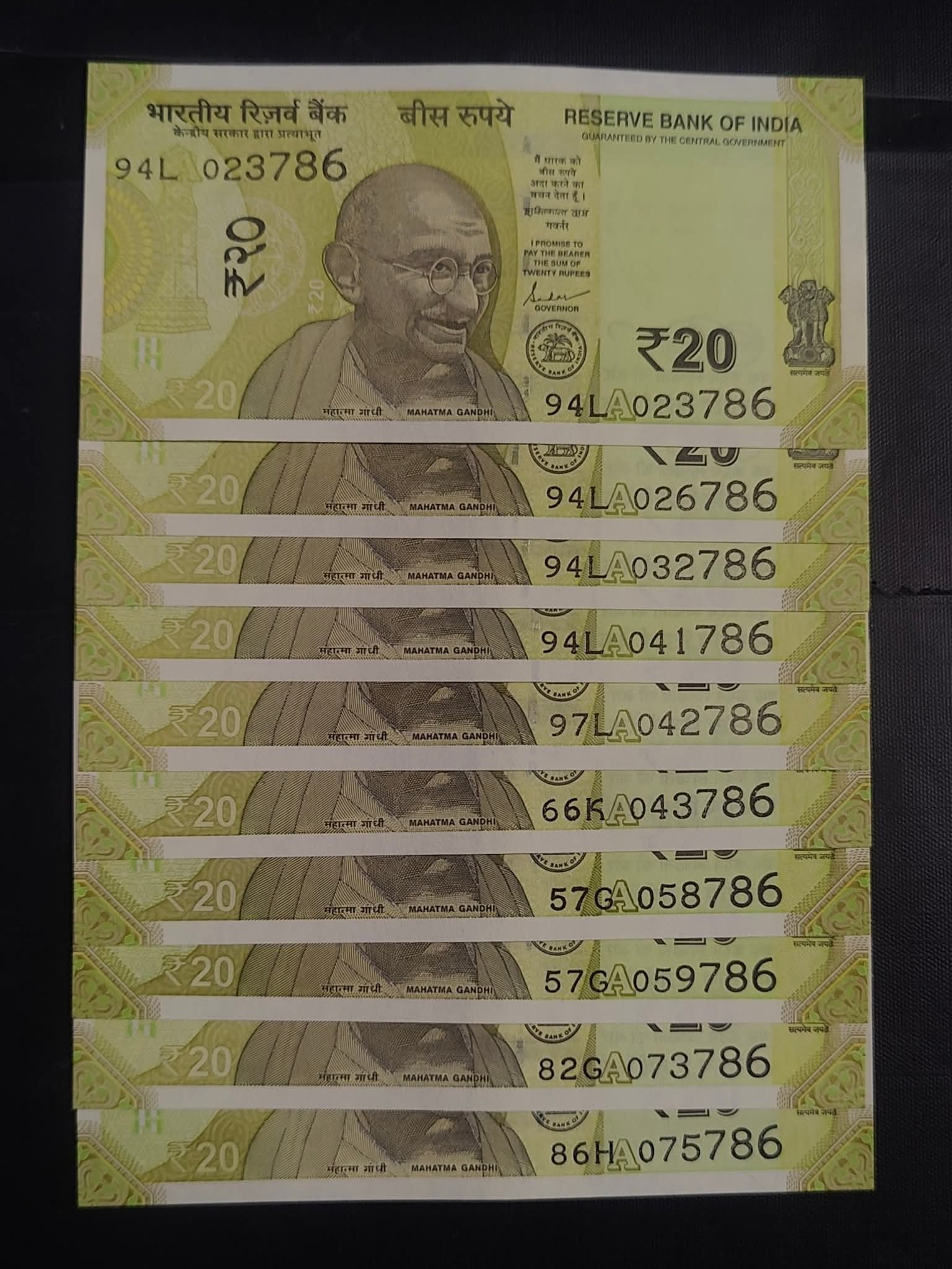 Reserve Bank of India.🏛️🏛️ HOLY NUMBER 20 Rupees ending 786 💎 GEM UNC CONDITION. 💎 SHIPPING CHARGES EXTRA 10 piece given Same and similar piece available