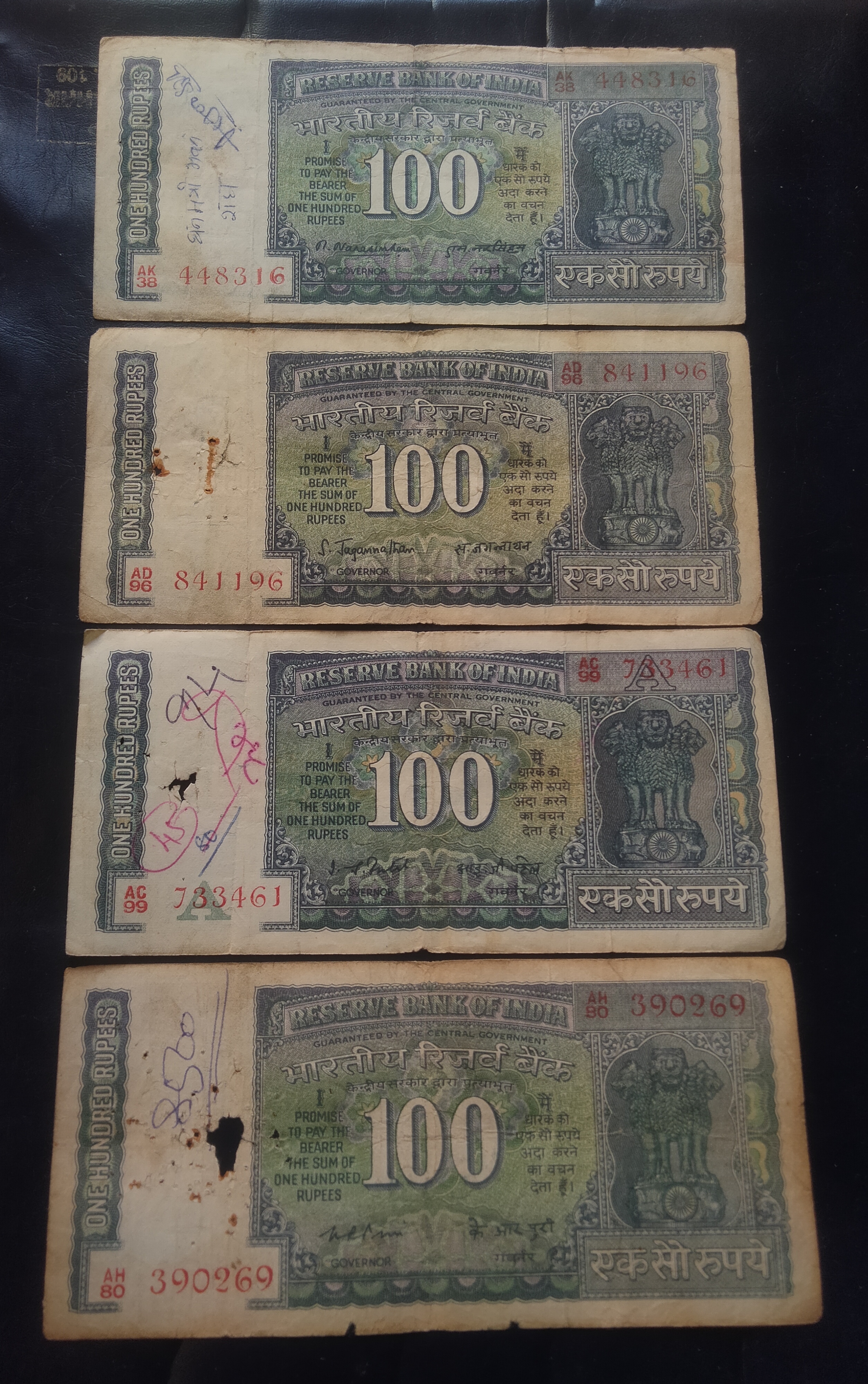 Reserve Bank of India 100 ₹ note 4. different signature 1. M. Narshiam 2 s. Jagannath 3. Ig. Patel 4. KR. Puri Condition as imege 4 piece given Same and similar piece available