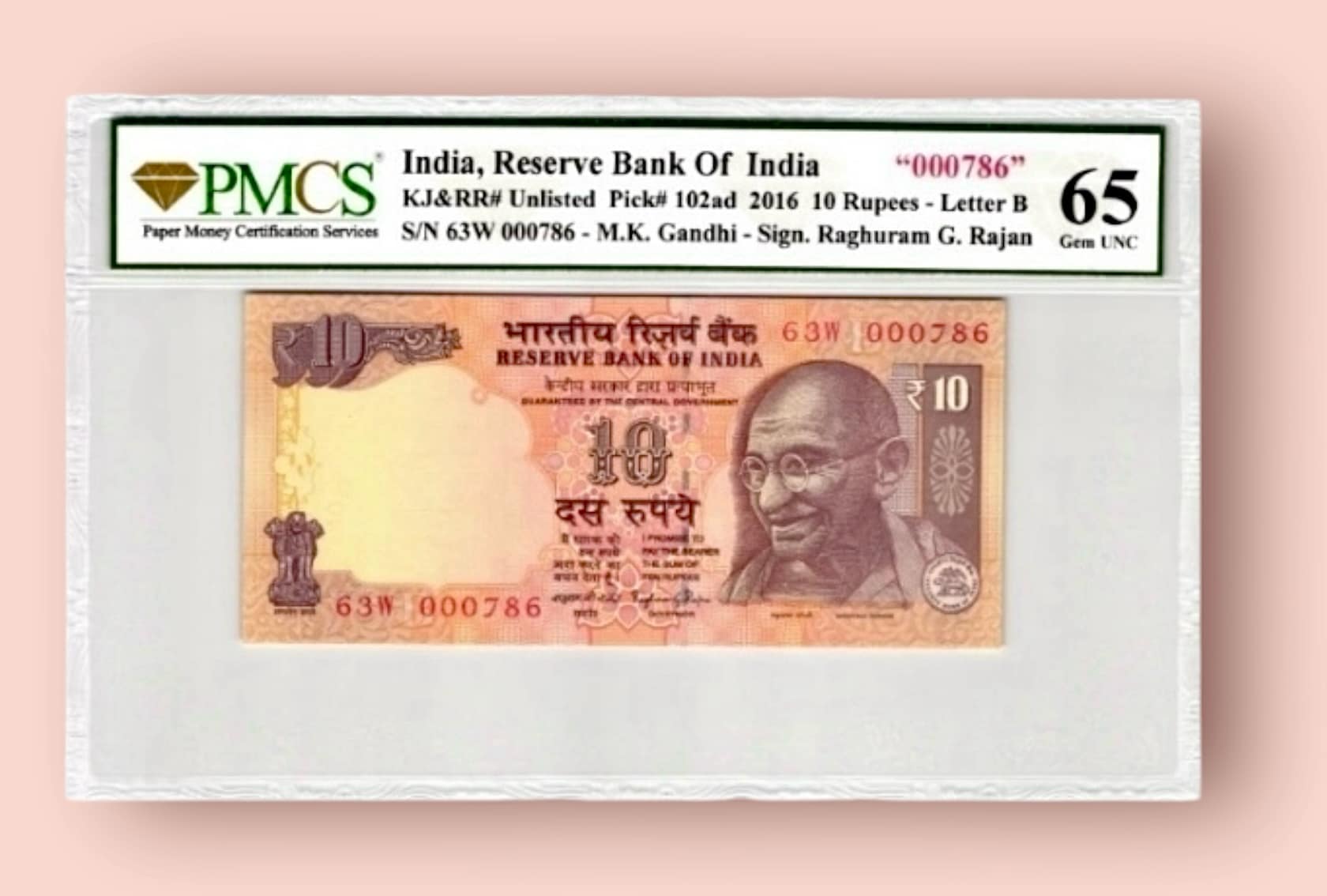 Rs 10 REPUBLIC INDIA BANKNOTE GRADED 65 Inset B signed by Raghuram Rajan HOLY NUMBER 000786 GEM UNC Unique and Rare