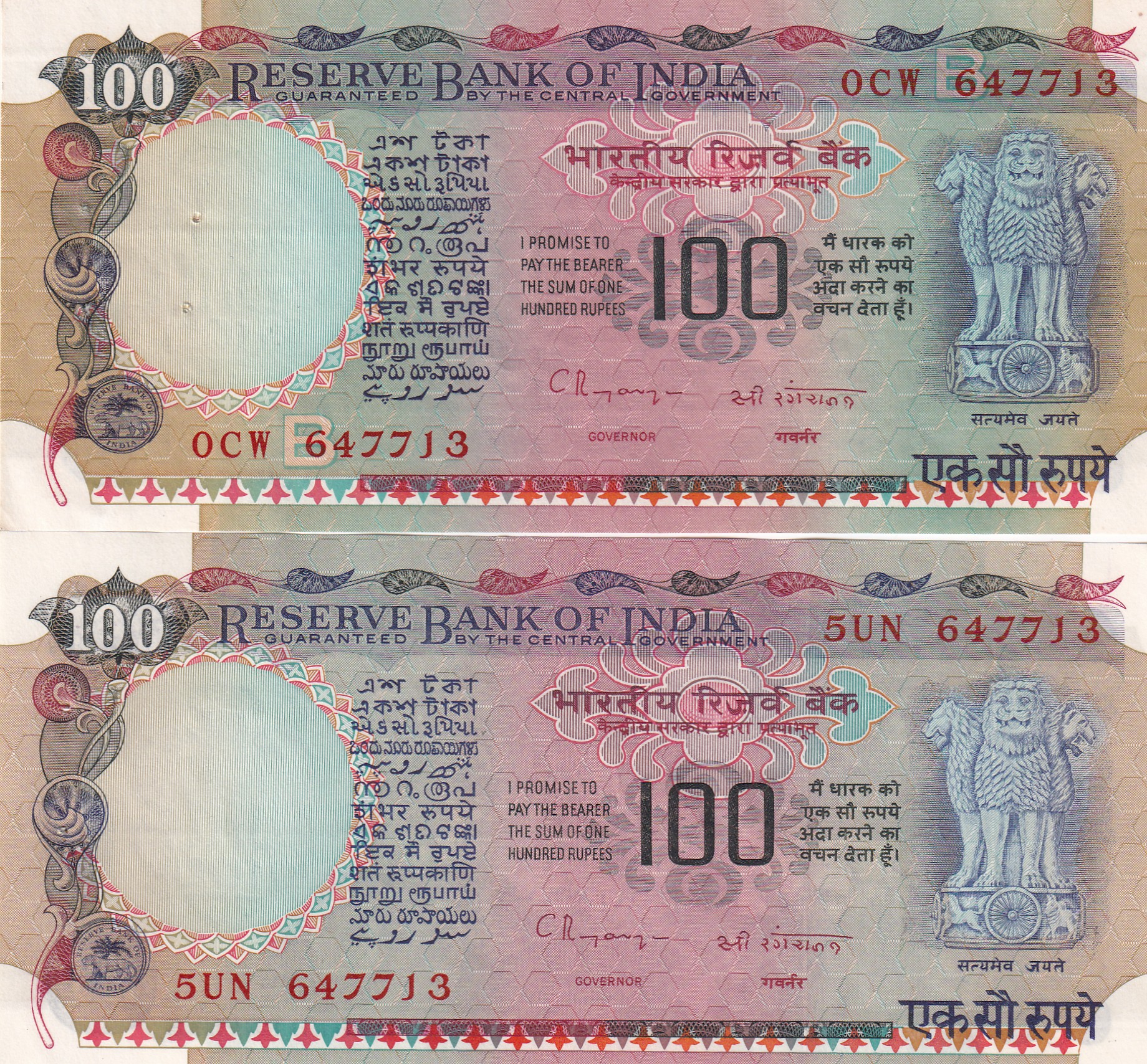 SAME SUFFIX NUMBER (647713) 100 RUPEES GOVERNOR C. RANGARAJAN OLD ISSUE (2 NOTE) SET