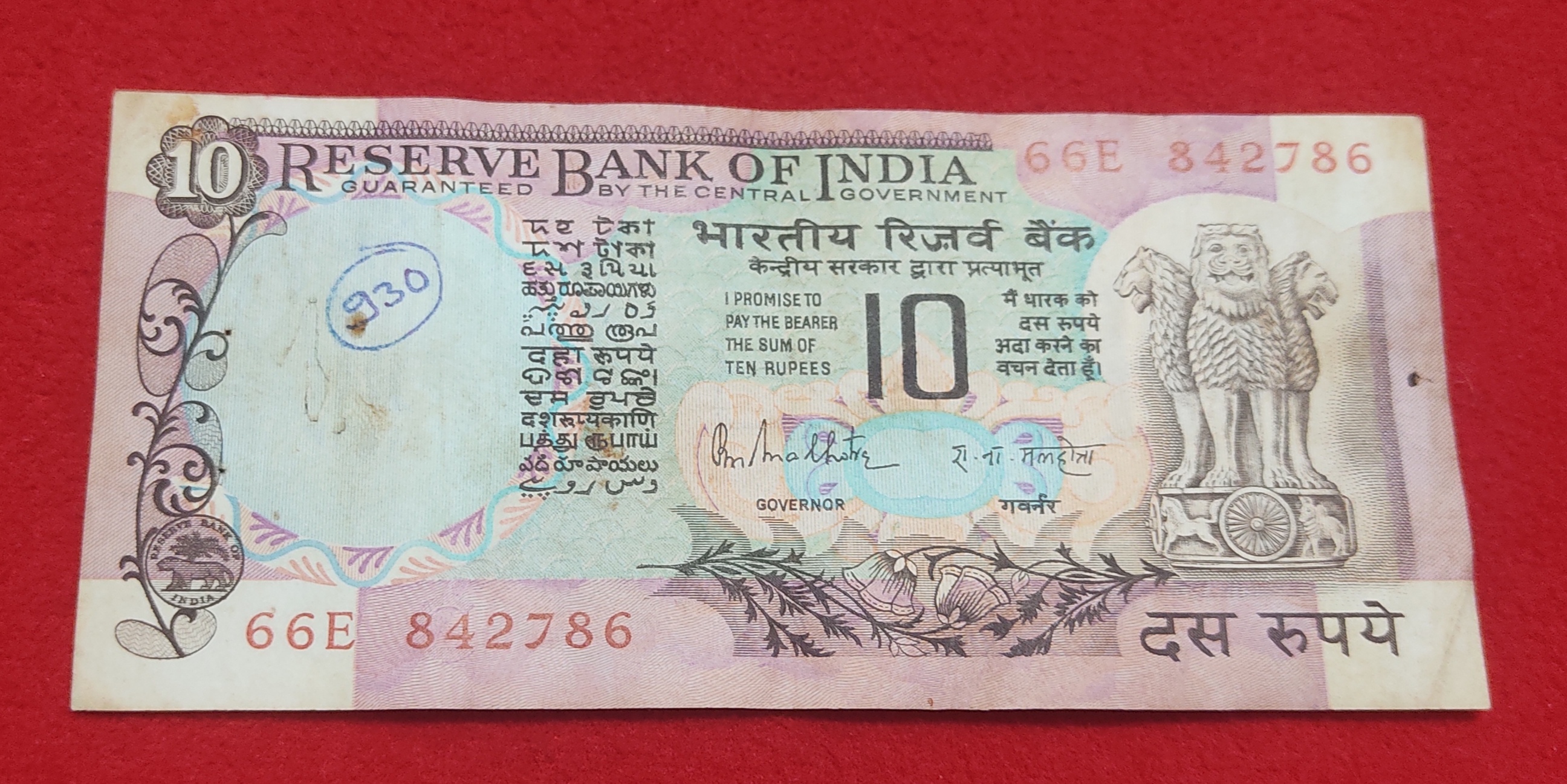 TEN RUPEES NOTE GOVERNOR R. N. MALHOTRA PEACOCK ISSUE ENDING 786 NUMBER