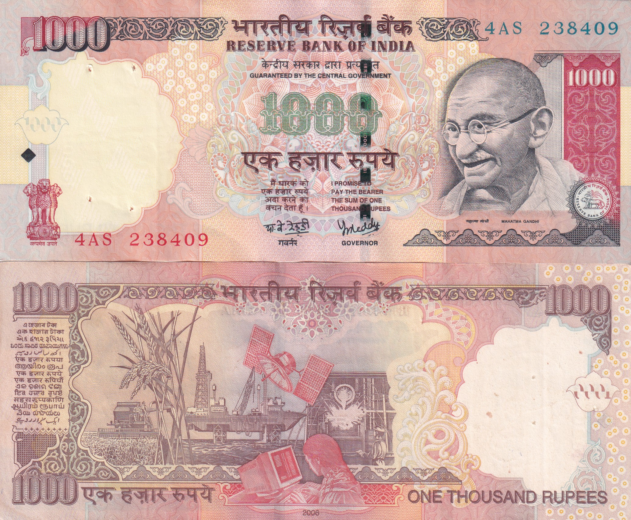 Y.B.Reddy (PLAIN INSERT 2006) 1000 Rupees Top condition Note without Pen Mark ; * *BUYER WILL RECEIVE DIFFERENT SERIAL NUMBER 1 NOTE* *