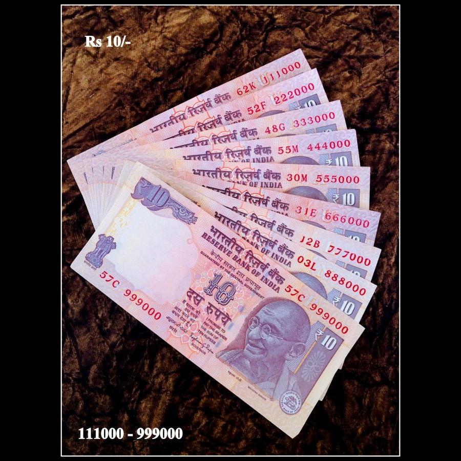 Rs 10 India Banknote Set 111000 to 999000 Gem UNC Unique 9 Note set Small Font Issue