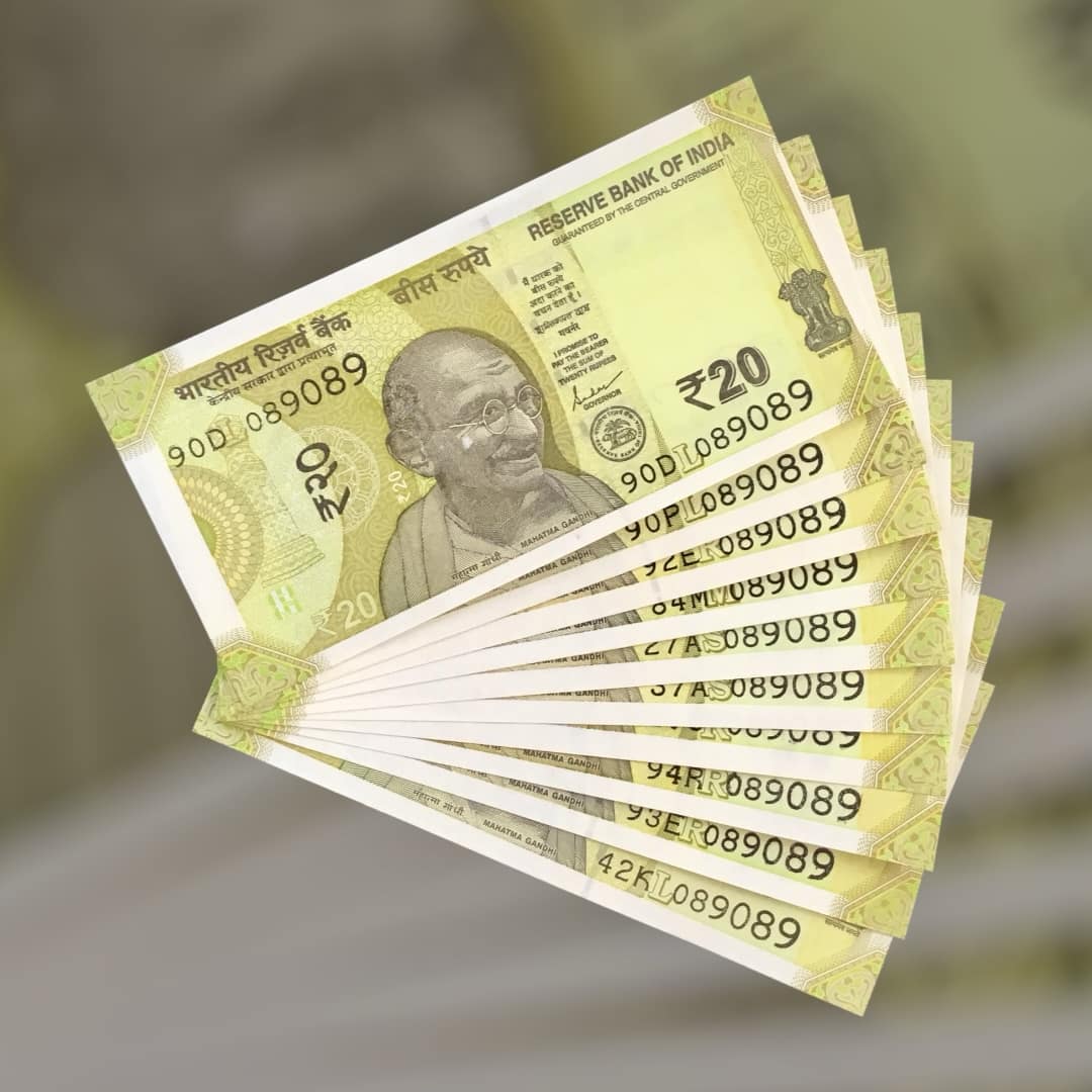 RS 20 INDIA BANK NOTE SEMI FANCY 10 NOTE SAME NUMBER SETS 089089 UNIQUE AND RARE