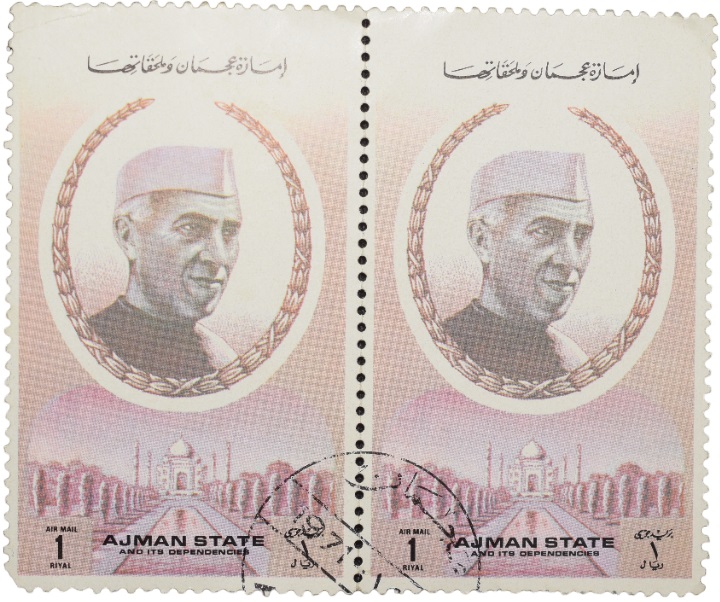 Airmail CTO Stamp of UAE – Ajman State with Jawahar Lal Nehru 1 Riyal Block of 2 Stamps – 1st Prime Minister of India – Used Condition as per Image.