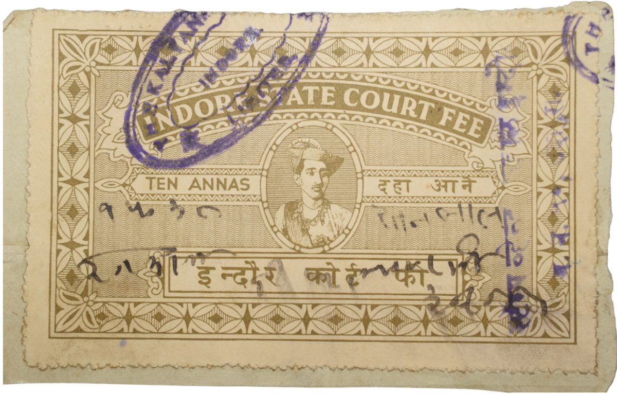 Court-Fee Stamp of Indore State Green Colour 10 Annas Used Condition as per Image.