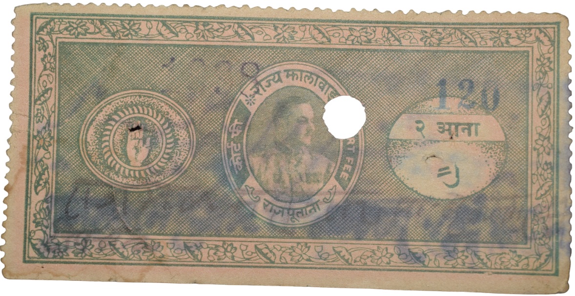 Court Fee Stamp of Jodhpur(Marwar) State Green Colour 2 Annas – Used Condition as per Image.