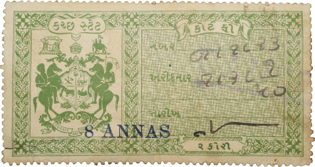 This Court Fee Stamp of Kutch State in Green Colour, denominated as 1/4 Kori, offers a fascinating glimpse into the history of the region. Issued in a used condition, this stamp bears the marks of time and usage, adding to its authenticity and charm. The Kutch State, known for its rich heritage and distinct culture, administered its court fees through such stamps, making them significant artifacts for collectors and history enthusiasts alike.