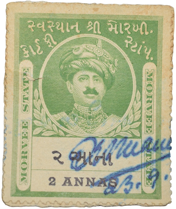 Court Fee Stamp of Morvee State Green Colour 2 Annas – Used Condition as per Image.