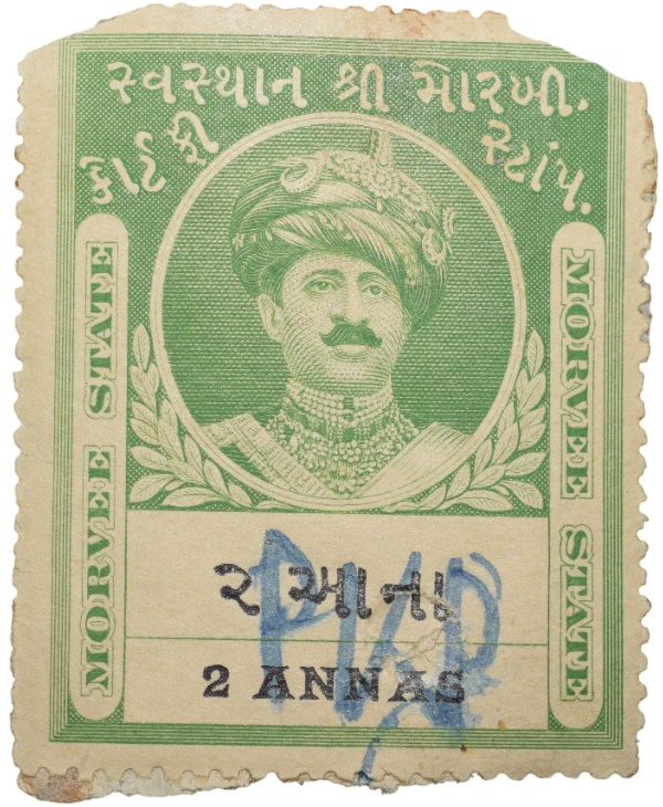 Court Fee Stamp of Morvee State Green Colour 2 Annas – Used Condition as per Image.
