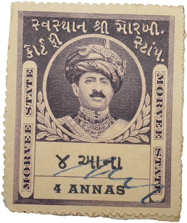 Court Fee Stamp of Morvee State Purple Colour 4 Annas – Used Condition as per Image.