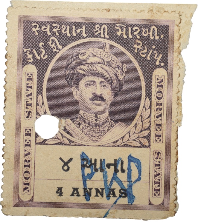 Court Fee Stamp of Morvee State Purple Colour 4 Annas – Used Condition as per Image.