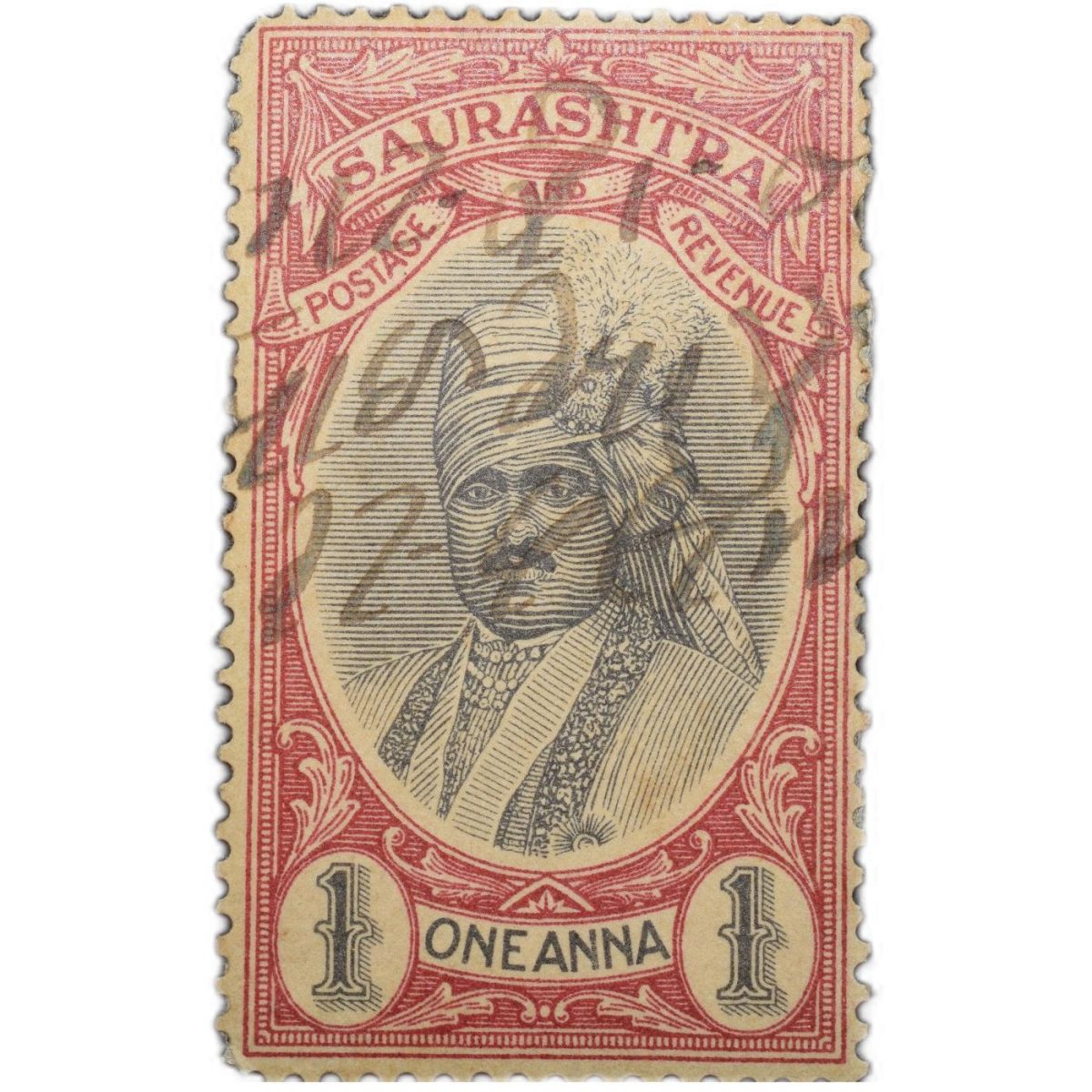Postal & Revenue Stamp of Saurashatra State – Red & Black Colour 1 Anna Used Condition as per Image.