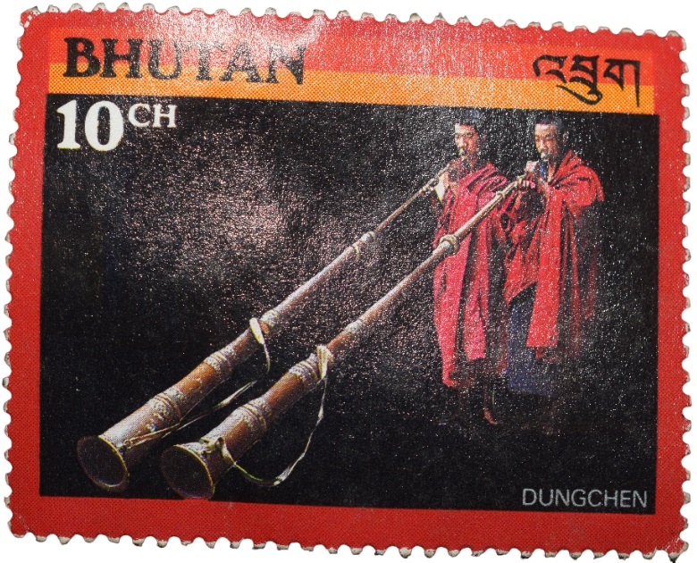 Postal Stamp of Bhutan Country – 10 Chhertums with Dungchen – Sound playing instrument Mint Un-Used Condition as per Image