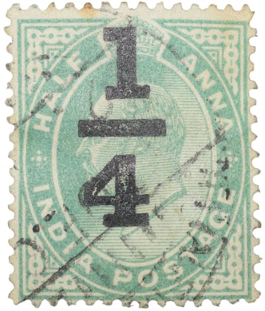 Postal Stamp of Edward VII 1/2 Anna Green Clour – Over Printed 1/4 – Used Condition as per image.