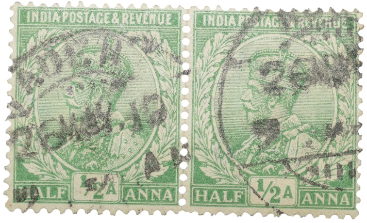 Postal Stamp of George V 1/2 Anna Green Colour – Block of 2 Stamps – Used Condition as per image.