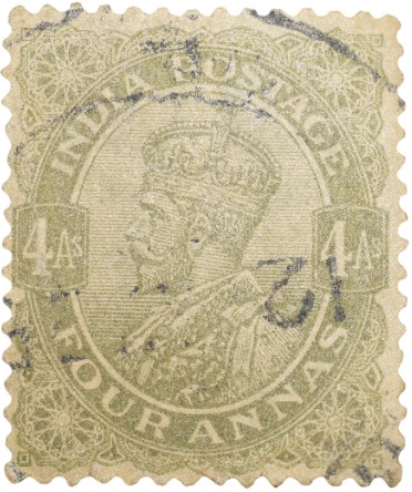 Postal Stamp of George V 4 Annas Olive Green Colour with Service Over Printed – Used Condition as per Image.