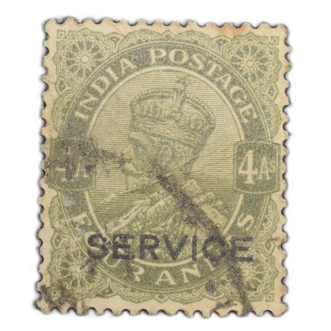 Postal Stamp of George V 4 Annas – Sage Green Colour – with Service Over Print in Black – Ty.71 Sta