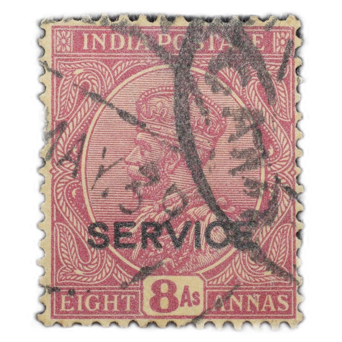 Postal Stamp of George V 8 Annas (AD 1912) – Deep Magenta Colour – with Service Over Print in Black