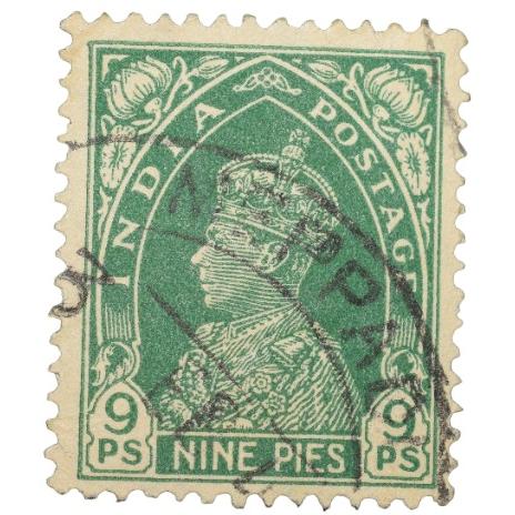 Immerse yourself in the rich history of numismatics with this exquisite Postal Stamp of George VI in green color, denominated at 9 Pies and bearing the mark of heavy usage, adding character and authenticity to its appearance. Issued during the reign of George VI, this stamp holds a significant place in philatelic collections, showcasing a glimpse of historical correspondence and postal systems of that era. Collectors and enthusiasts will be captivated by the charm and allure of this vintage stamp, appreciating its rarity and the tangible connection it offers to a bygone era. Its fine condition, as depicted in the accompanying image, enhances its collectible value and makes it a prized addition to any philatelist’s treasure trove.