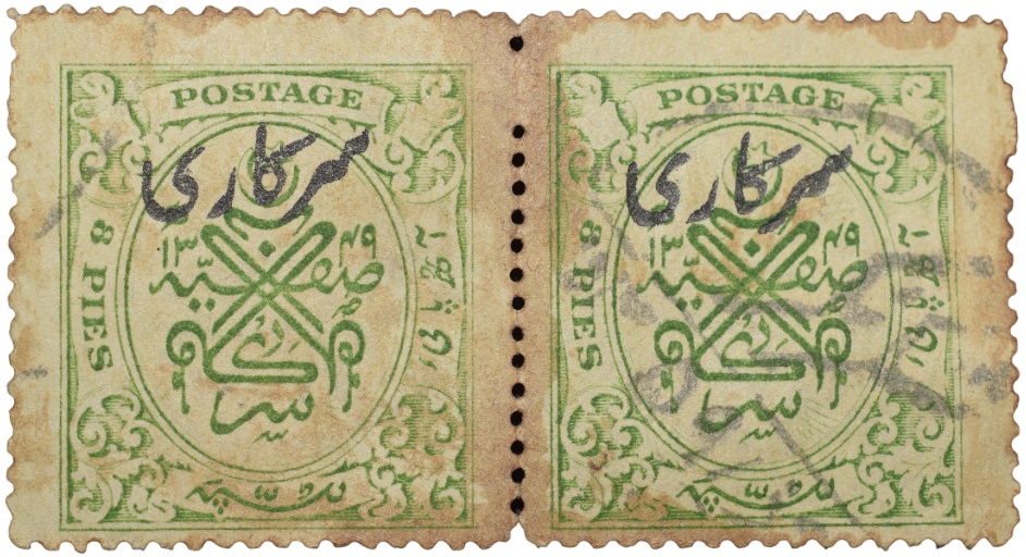 Postal Stamp of Hyderabad State – Dull Green Colour 8 Pies – With Sarkari Over Print in Black – Block of 2 Stamps – Used Condition as per Image.