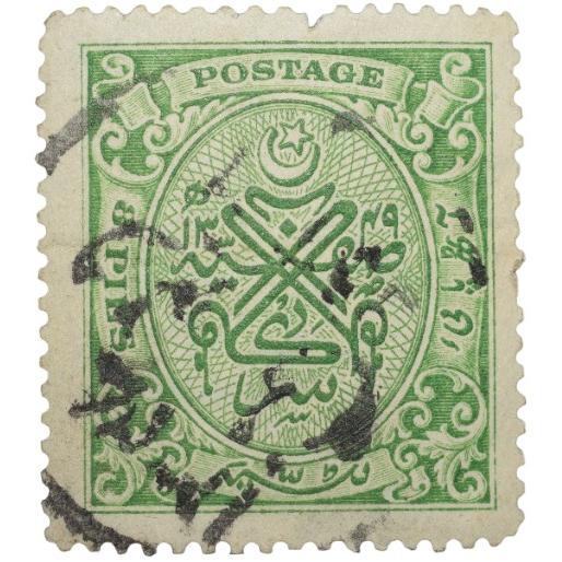This Postal Stamp of Hyderabad State in green color with a denomination of 8 Pies is a captivating piece of history in fine, heavily used condition. Issued during a significant era, this stamp reflects the cultural and historical importance of Hyderabad State. Dating back to a bygone time, this collectible item showcases intricate design details and serves as a tangible connection to the past. Collectors and enthusiasts are drawn to this stamp for its rarity, historical value, and unique representation of the region. The used condition adds character and authenticity to the piece, making it a prized addition to any collection. This stamp comes with a provenance that enhances its appeal, making it a must-have for those passionate about philately and historical artifacts.