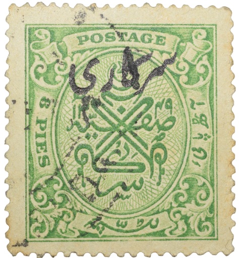 Postal Stamp of Hyderabad State – Green Colour 8 Pies With Sarkari Over Print in Black – Used Condition as per Image.