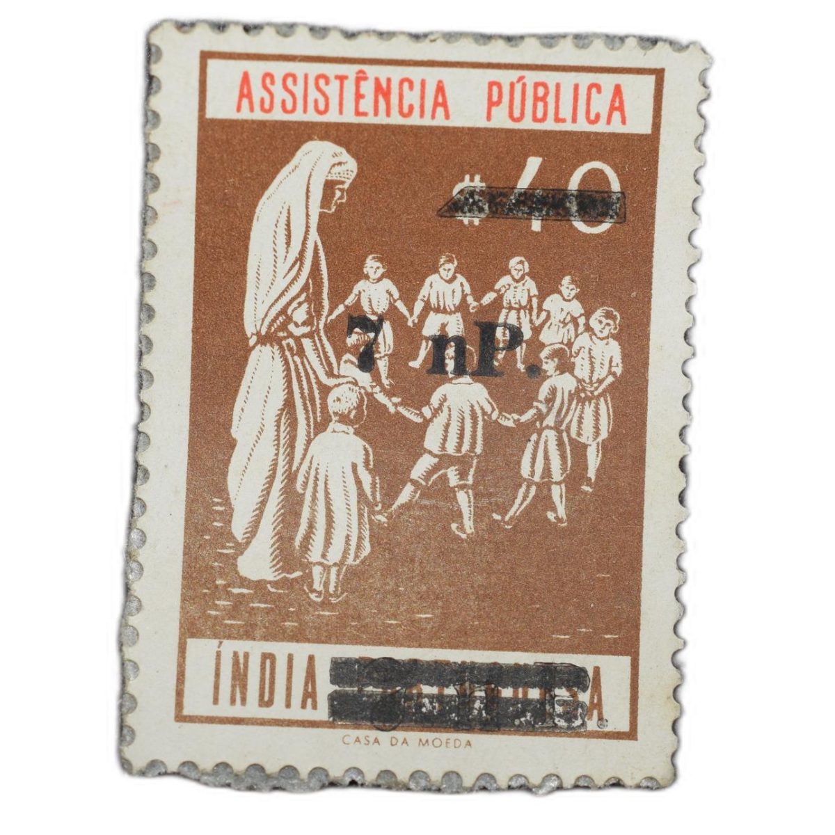 Postal Stamp of India Portugues – Assistencia Publica Cancelled and Over Printed Brown 7 New Paise b