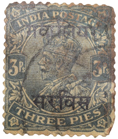 Postal Stamp of Indian Conventional States – Gwalior State George V Grey Colour 3 Pies – ‘Gwalior Service’ Over Printed in Nagari – Used Condition as per Image.