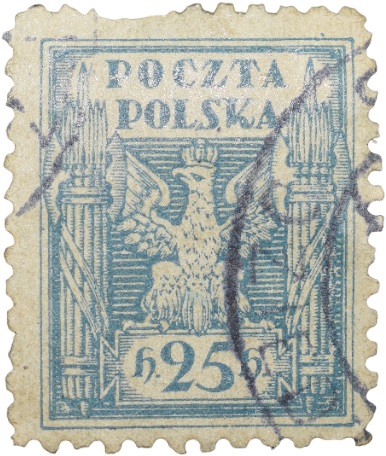 Postal Stamp of Poland (AD 1919 January 27), An 25 fenigi light blue postage stamp depicting Crowned Polish Eagle and Fasces, Symbolical of United Poland