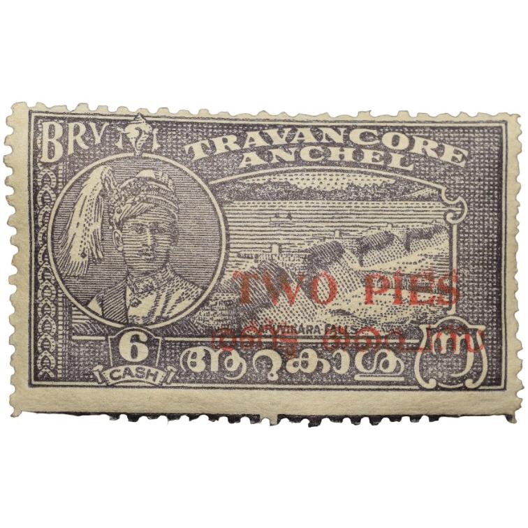 Postal Stamp of Travancore Anchal 6 Cash Over Printed in Red ‘Two Pies’ Mint Un-Used Condition as pe