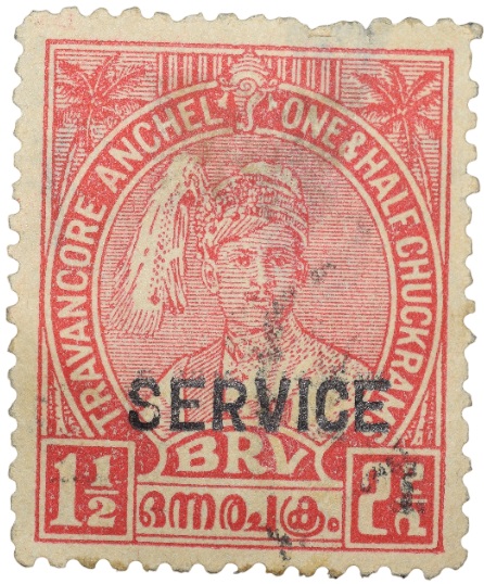 Postal Stamp of Travancore Anchel Red Colour 1-1/2 Chukram – ‘Service’ Over Printed – Used Condition as per Image.