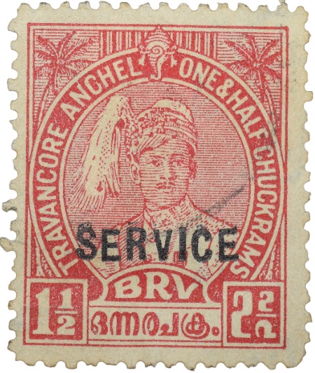 Postal Stamp of Travancore Anchel State 1-1/2 Chukrams Red Colour – Over Printed in Black ‘Service’ – Used Condition as per Image.