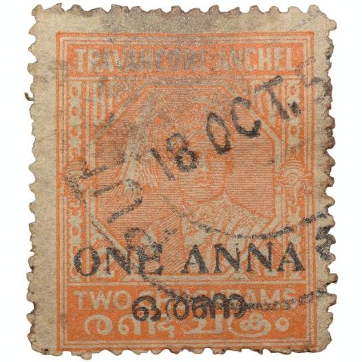 Postal Stamp of Travancore Anchel State 2 Chukrams Orange Colour – Over Printed in Black ‘One Anna’