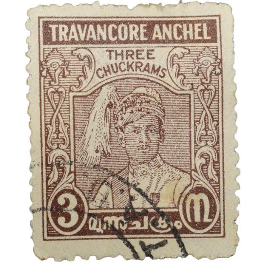 Postal Stamp of Travancore Anchel State 3 Chukrams Brown Colour – Used Condition as per Image.