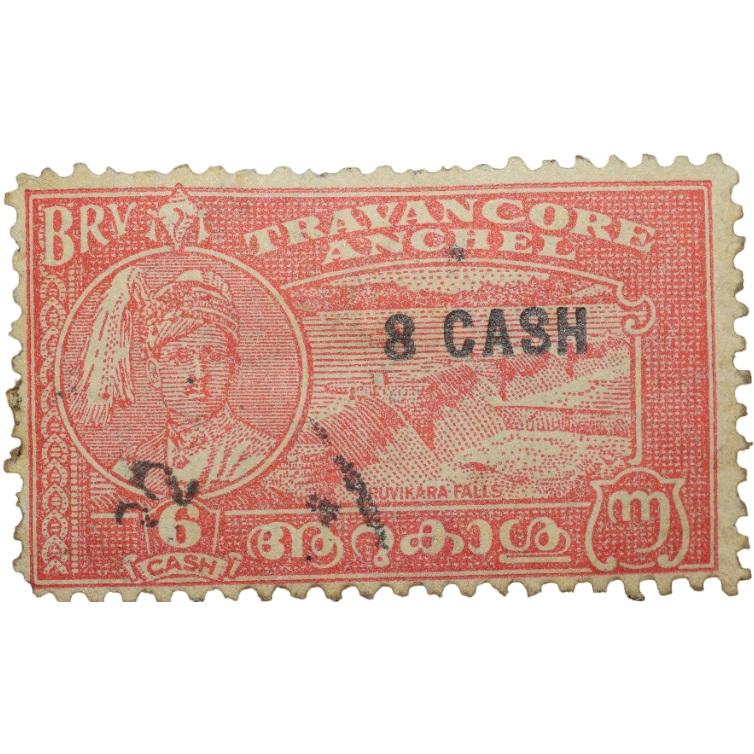 Postal Stamp of Travancore Anchel State 6 Cash Red Colour – Over Printed in Black ‘8 Cash’ – Used Co