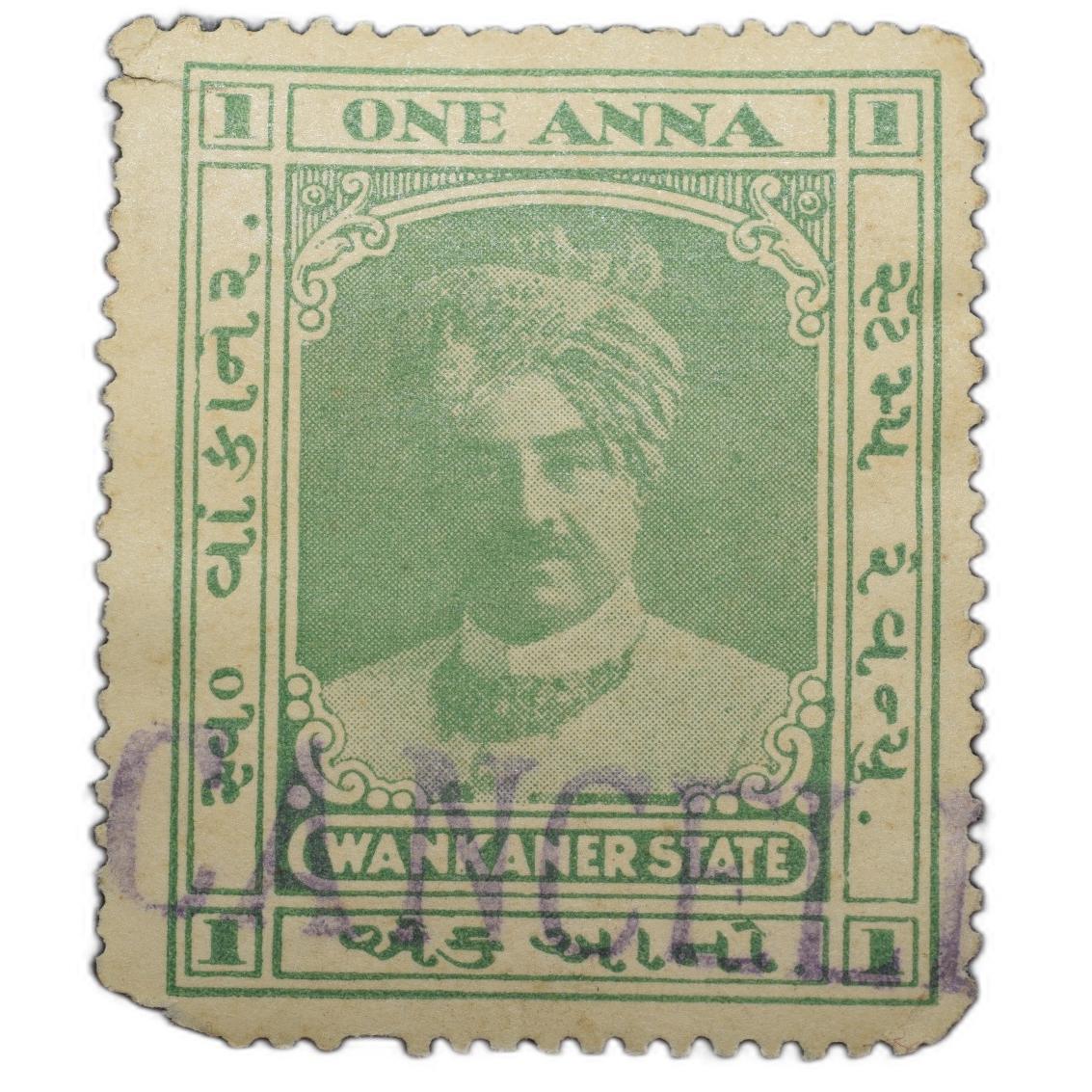 Postal Stamp of Wankaner State – Dull Green 1 Anna – ‘Cancelled’ Over Stamped – Mint Un-Used Conditi