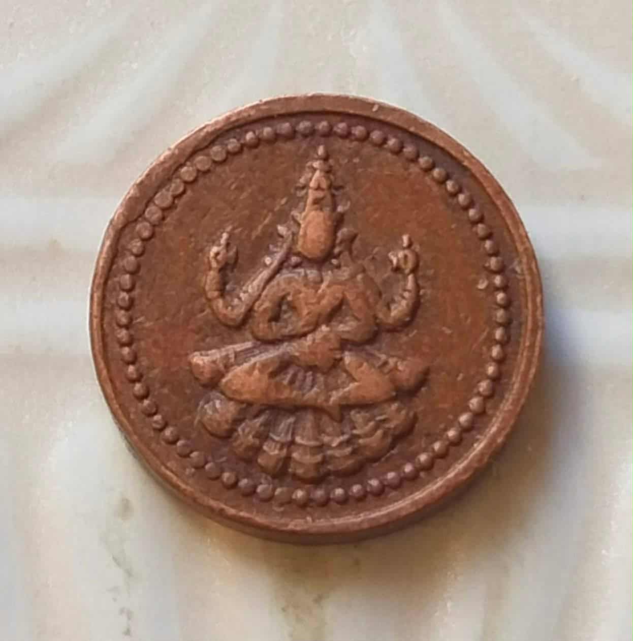 1 Cash copper coin Pudukottai princely state – a small princely state that extended over almost all of the modern day district of Pudukottai in Tamil Nadu. The copper coin features an image of Martanda Bhairav, a form of Lord Shiv. These coins are very small in size – just 11.5 mm across and 1.25 grams in weight. These are machine struck coins, first minted in Birmingham and then at the Calcutta mint, from 1889-1906. Same and similar piece available