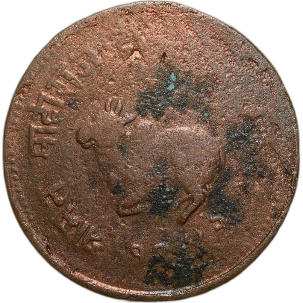Indore State, Shivaji Rao Holkar, (VS1943-1960/1886-1903AD), Copper 1/4 Anna, Nandi Seated Type, Obv: Continuous legend with ruler’s name & “Indore”, bull reclining left, Rev: Nagri Inscription in Retrograde, 6.02 Gms, 25.73 mm, About Fine, Rare Variety.