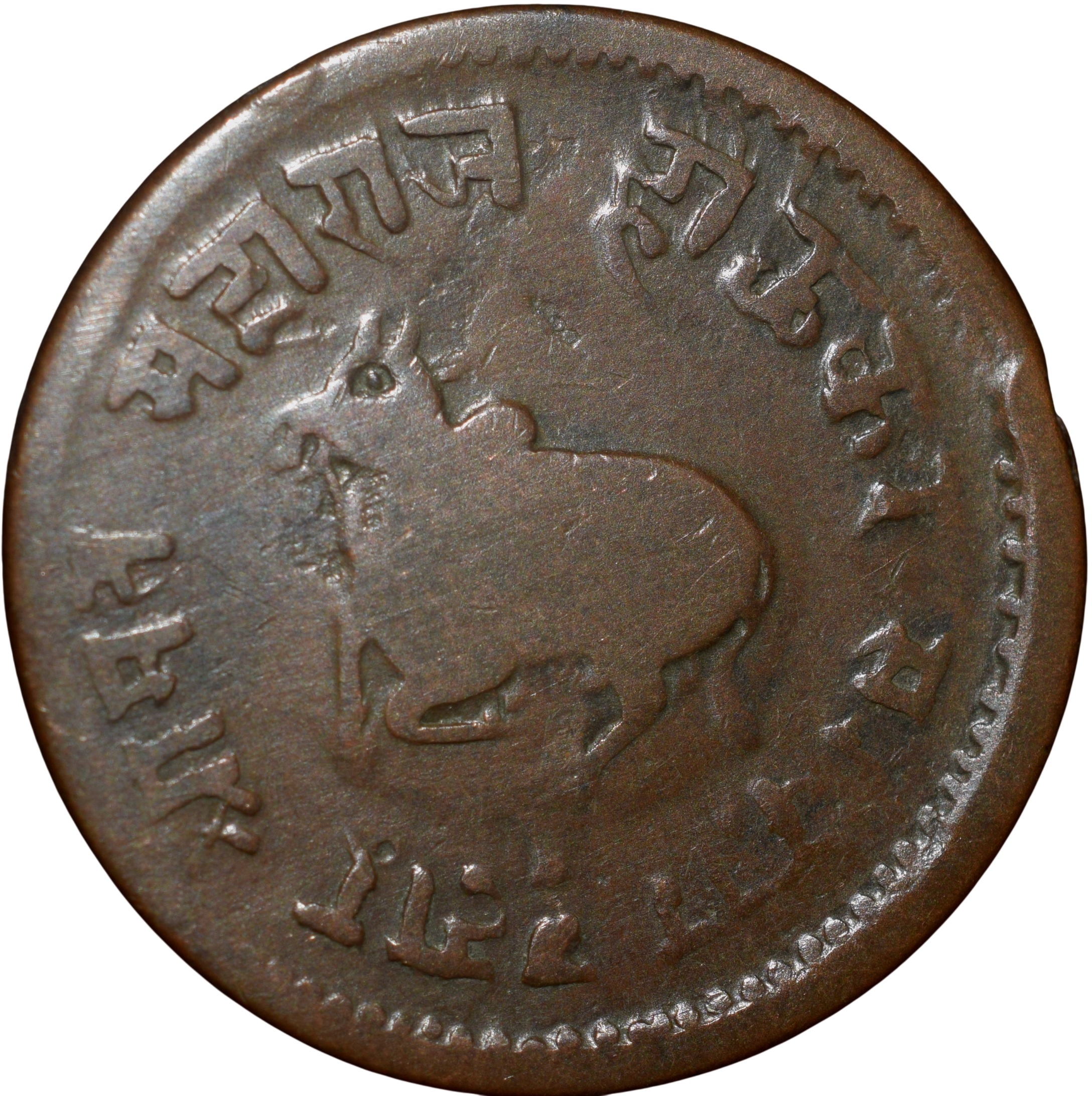 Indore, Shivaji Rao Holkar (VS1943-1960/1886-1903AD), Copper 1/4 Anna, Nandi Seated Type, Obv: Continuous legend, “Indore” below bull reclining left, Rev: Date below denomination, Dated VS1944 6.36 Gms, 25.67mm, (KM # 32.3), About Very Fine, Scarce.