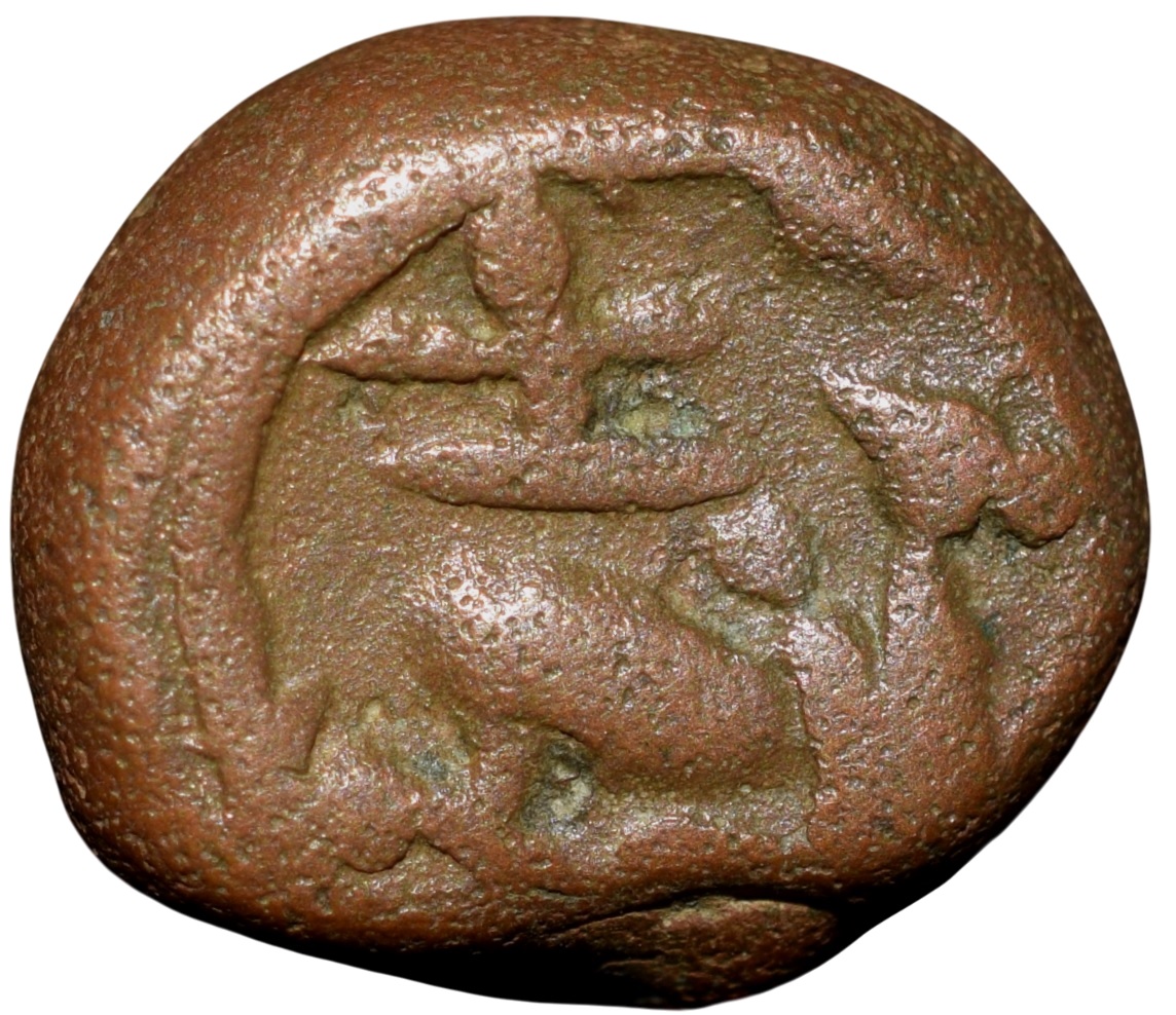Tanjore Nayakas, (16th Cen. AD), Copper Unit, Obv: Standing Lord Vishnu, Rev: Shivalinga, Below couchant bull, 3.06 Gms, 13.55 mm, (K.Ganesha Type 6.73), About Very Fine, Scarce.