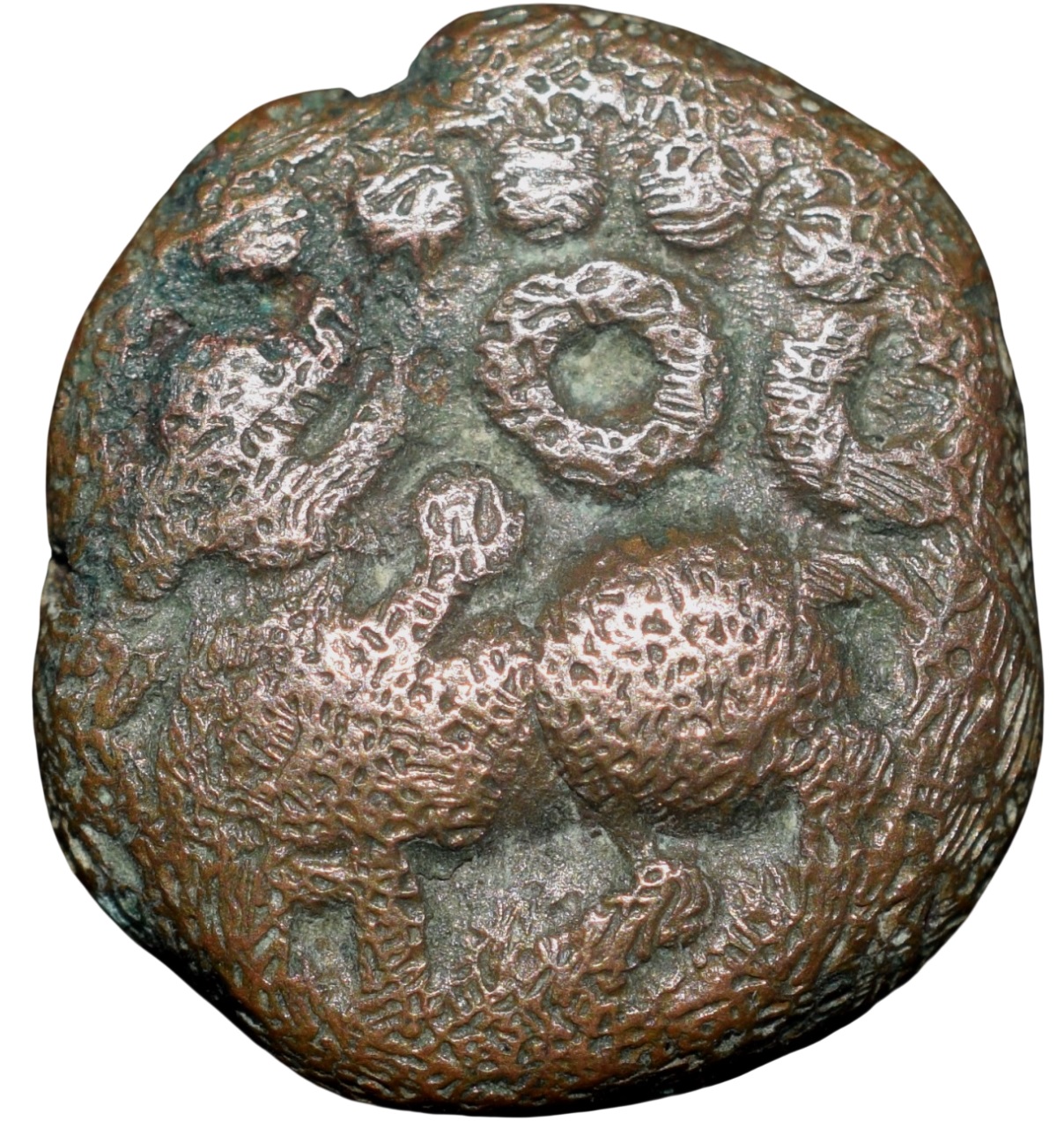 Vijayanagara Empire, Sangama Dynasty, Devaraya I (1406-1422 AD), Copper Jital, Obv: In circle of dots, humped bull to left with crescent moon & sun above, Rev: In circle of dots; in three lines Sri De Va/A dagger between conch and discuss/ra ya, 3.60 Gms, 11.66 mm, About Very Fine, Scarce.
