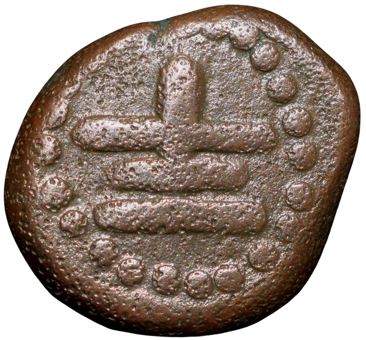 Shivaganga Raja’s, (16th – 17th Cen. AD), Copper Kasu, Obv: Lord Rama & Sita standing facing, Rev: Shivalingam, 3.30 Gms, 11.56 mm, About Fine, Rare.