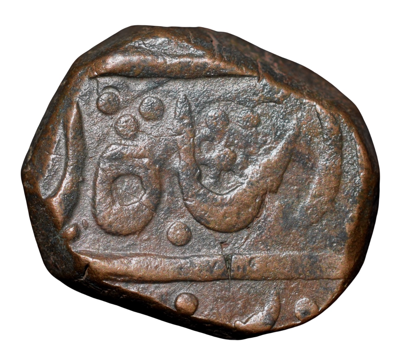 Bhonsala Raja’s of Nagpur, (17th – 18th Cen. AD), Copper Paisa, Obv: Shah Alam Badshah Ghazi Sikka Mubarak in Persian, Rev: Manus maimanat sanah julus, Double Leaf Solid Flag,18.66 Gms, (Bhonsala Raja’s of Nagpur, Type 104.1), Extremely Fine, Scarce.