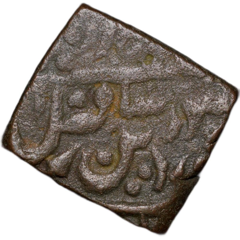 Gwalior, Daulat Rao (AH 1209-1243/1794-1827 AD), Ujjain Dar ul Fath Mint, Copper Paisa, Obv: Shah Alam II Inscription, Slanted Spear Mint Mark, Rev: Manus Maimanat Sanah julus zarb, Floral mint mark, 14.04 Gms, 15.43 x 16.73 mm, (KM # 221), About Extremely Fine, Rare.