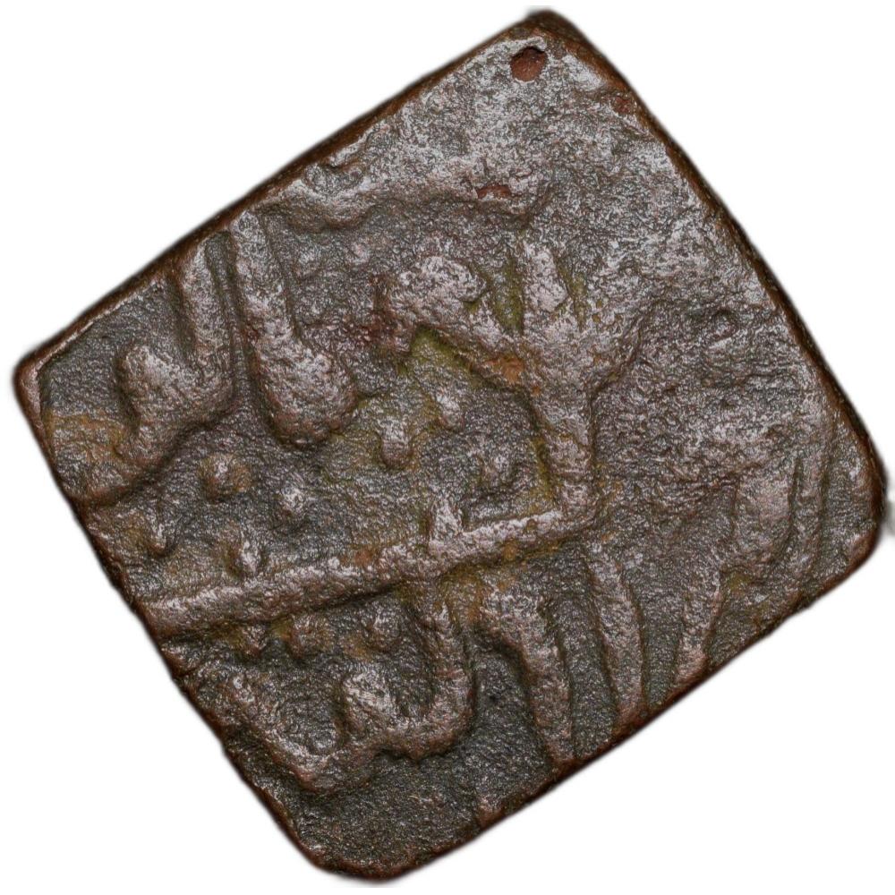 Gwalior, Daulat Rao (AH 1209-1243/1794-1827 AD), Ujjain Dar ul Fath Mint, Copper Paisa, Obv: Shah Alam II Inscription, Slanted Spear Mint Mark, Rev: Manus Maimanat Sanah julus zarb, Floral mint mark, 14.04 Gms, 15.43 x 16.73 mm, (KM # 221), About Extremely Fine, Rare.