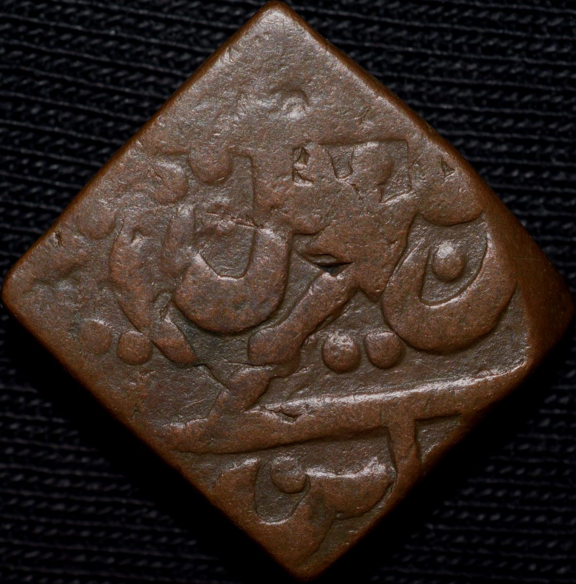 Gwalior, Daulat Rao (AH 1209-1243/1794-1827 AD), Ujjain Dar ul Fath Mint, Copper Paisa, Obv: Shah Alam II Inscription, Slanted Spear Mint Mark, Rev: Manus Maimanat Sanah julus zarb, Floral mint mark, 13.56 Gms, 18.77 x 19.42 mm, (KM # 221), About Very Fine, Scarce.