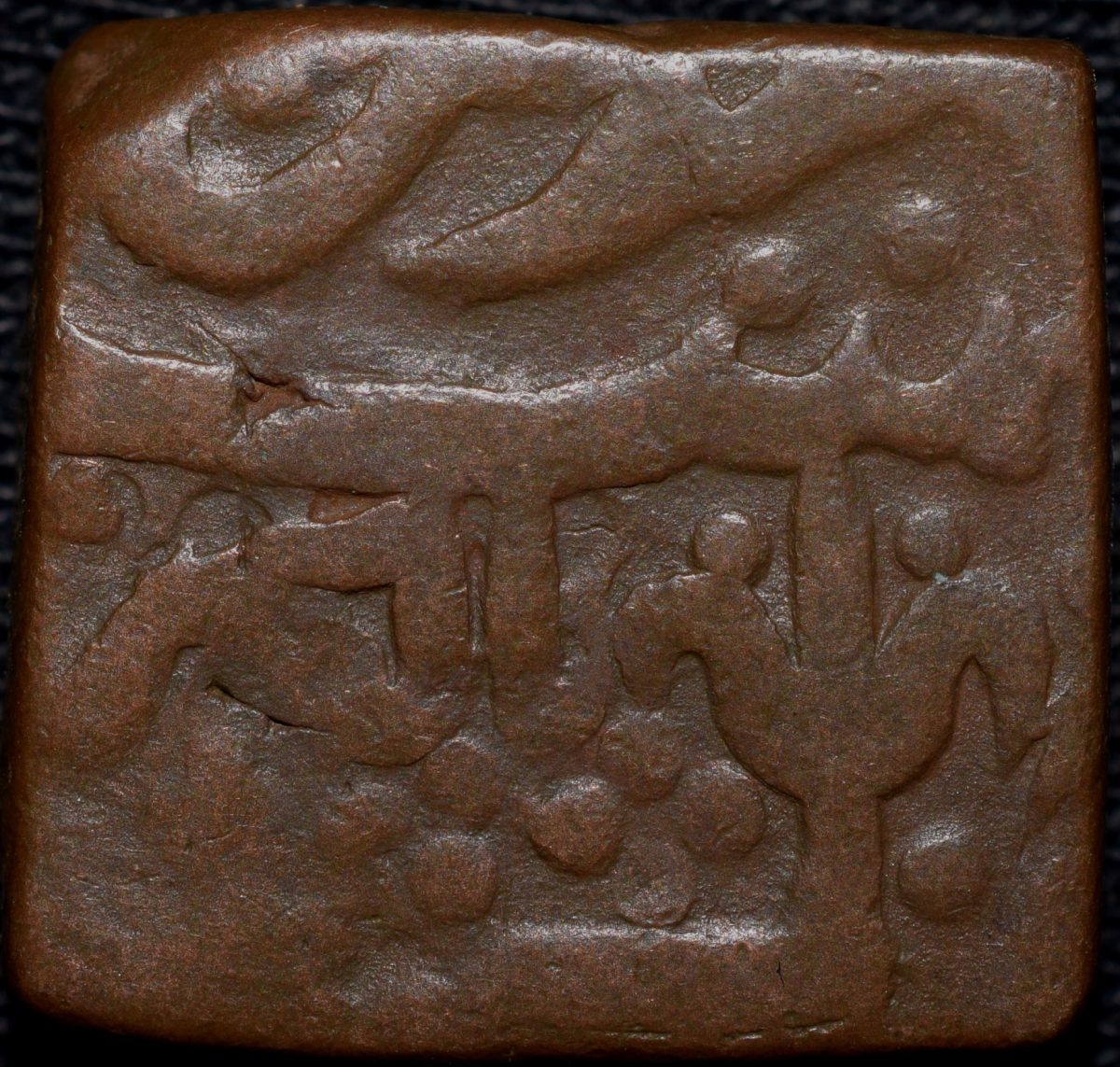 Gwalior, Daulat Rao (AH 1209-1243/1794-1827 AD), Ujjain Dar ul Fath Mint, Copper Paisa, Obv: Shah Alam II Inscription, Slanted Spear Mint Mark, Rev: Manus Maimanat Sanah julus zarb, Floral mint mark, 13.56 Gms, 18.77 x 19.42 mm, (KM # 221), About Very Fine, Scarce.