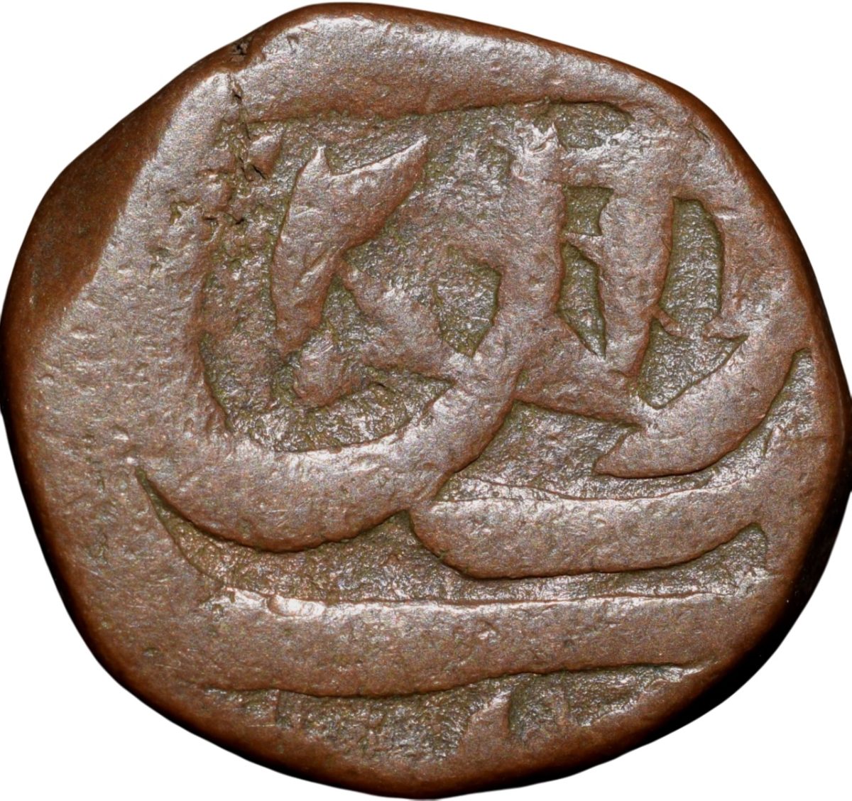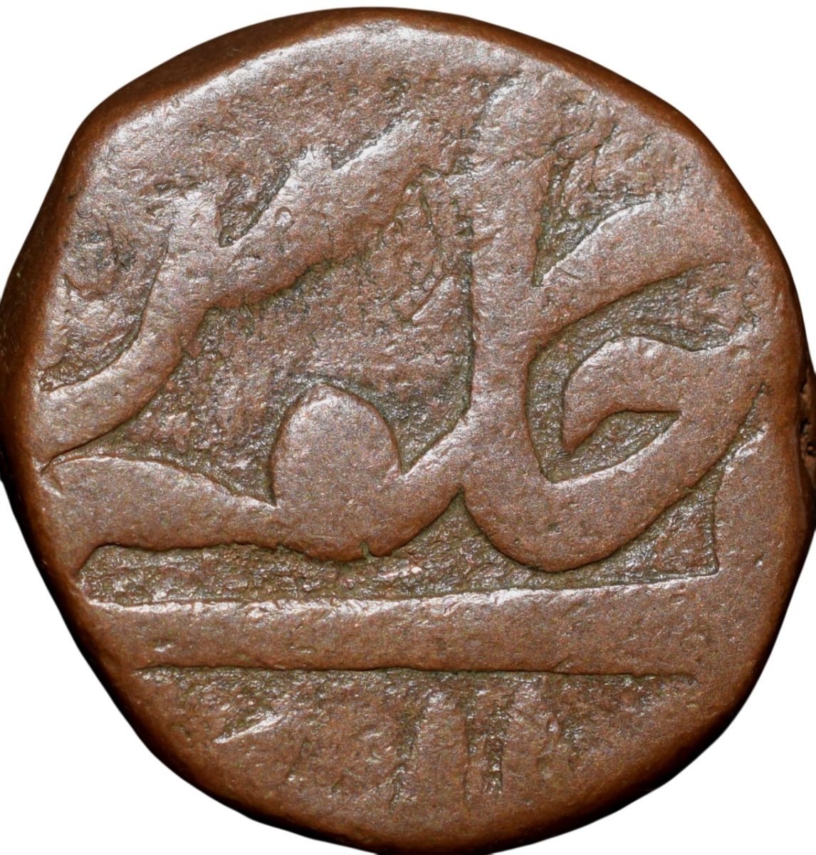 Gwalior State, Daulat Rao (AH1209-1243/1794-1827AD), Copper Paisa, Gwalior Fort Mint, Obv: Muhammad Akbar II inscription, Sahib-i-quirani, Rev: manus maimanat sanah julus, Dagger Mint mark, 8.14 Gms, 16.15 mm, (KM59), About Very Fine, Scarce.
