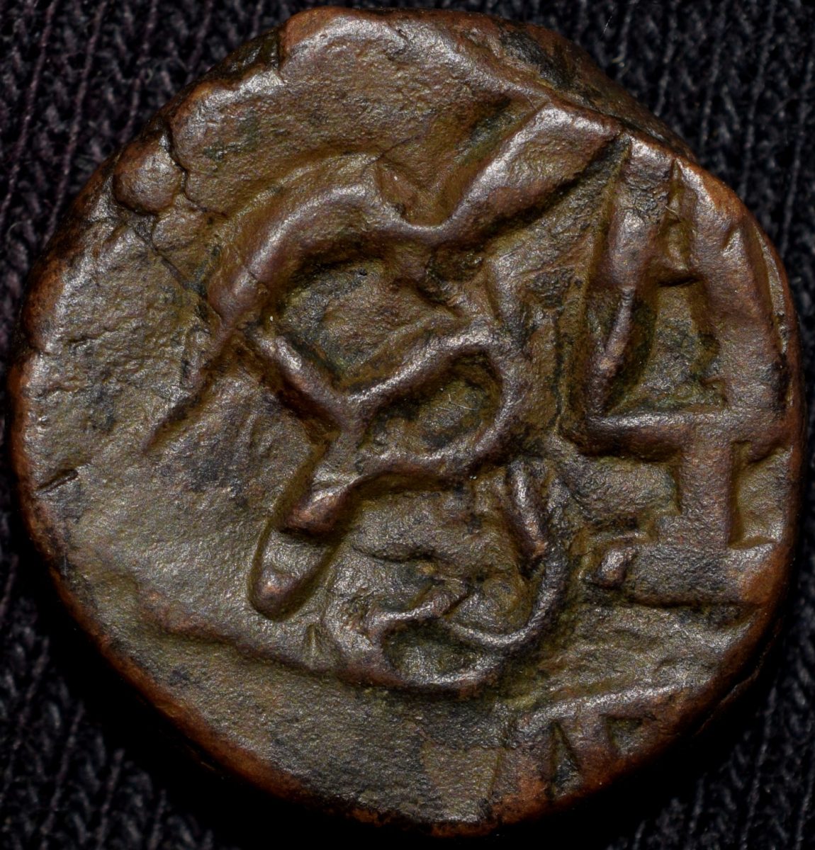 Dhar State, (17th – 18th Cen. AD), Anonymous Issue, Copper Paisa, Obv: Spear Mint Mark and some other Symbols, Rev: Nagari ‘Ji’, 7.16 Gms, 18.22 mm, Extremely Fine, Very Rare.